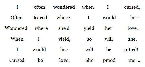 Almost a year late here, but I wanted to try clarifying the fifth line “Futility Closet”… “I would her will be pitied,” actually does make sense. The speaker would, by the woman in question, be pitied. The same message is reiterated in line six, in more straightforward language. “Cursed be love! She pitied me…”