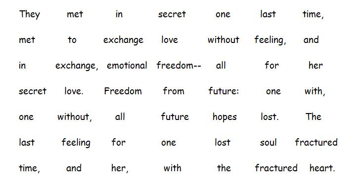 HOWEVER this particular poem’s inspiration is not about a broken heart; it’s about a girl who has just realized she’s pregnant from a guy whom she loves but who doesn’t love her, and she’s not going to tell him about the baby. it effectively changes her future but he goes on unaffected.