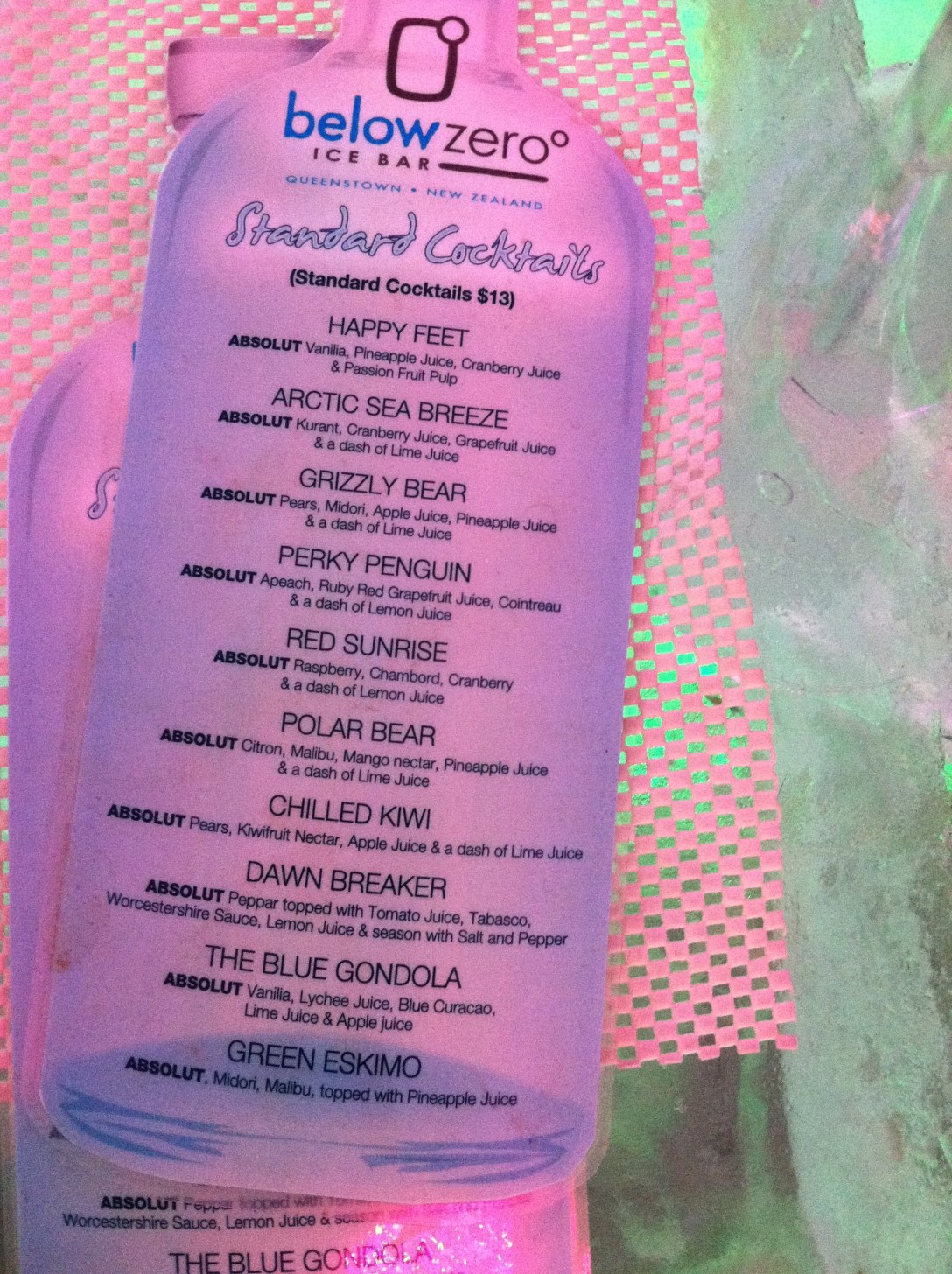 I forgot to mention, they bedecked us in coats and gloves, really awful gloves that are meant for gardening more than warmth, I think, and boots for those who needed them. I was missing my Northface jacket. Had I not been wearing two layers, my normal standard for Queenstown this summer, I would have been very cold. As it was, I was only mildly cold. After ten minutes, however, I said let’s down these drinks and take some pictures and get back outside!