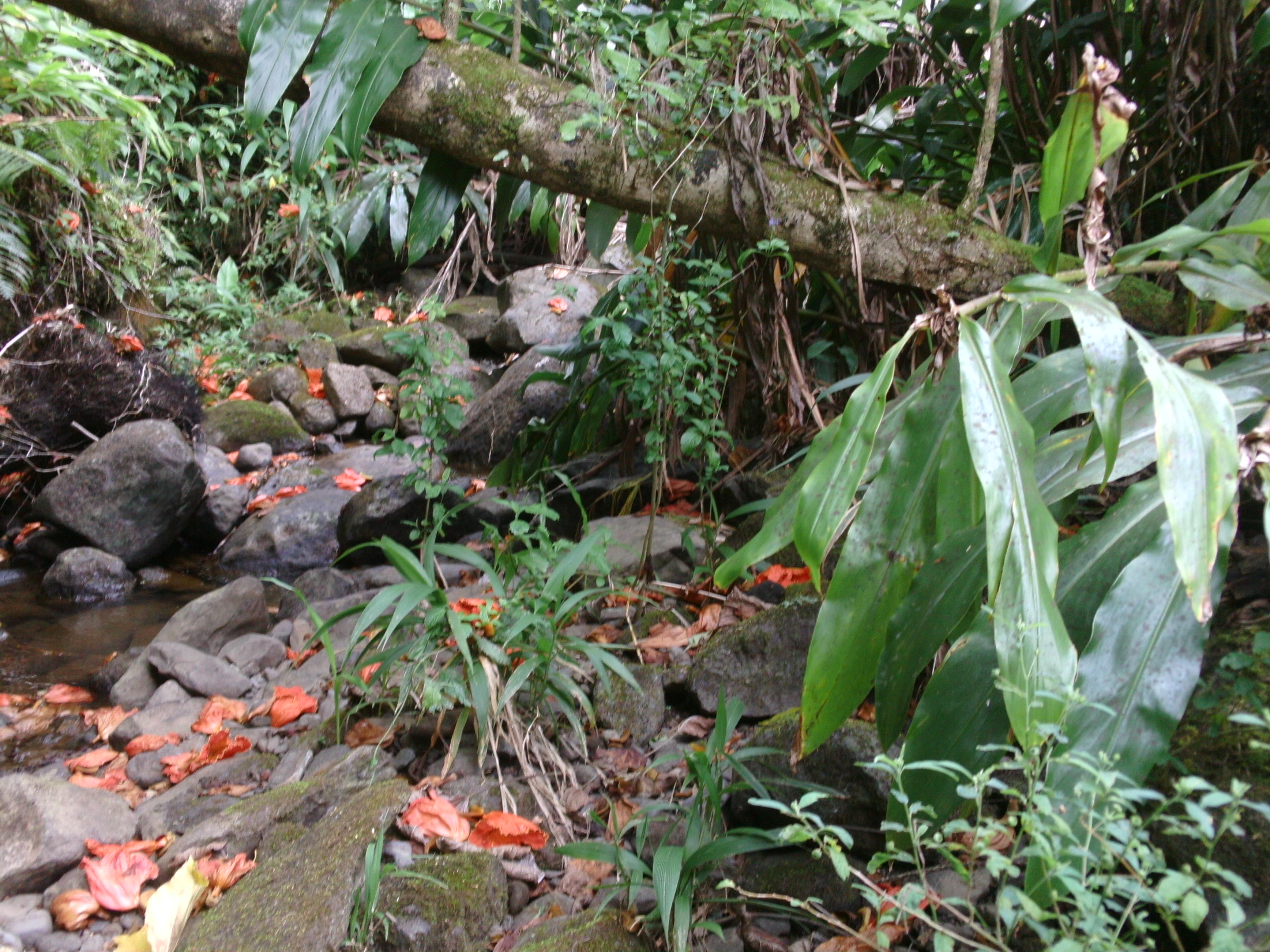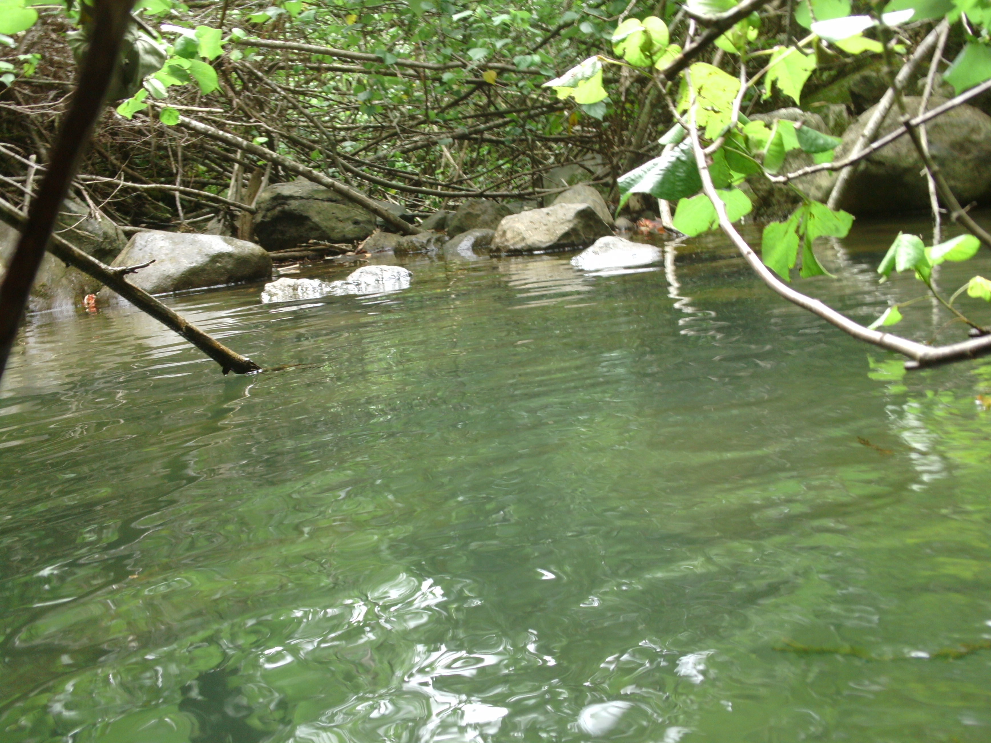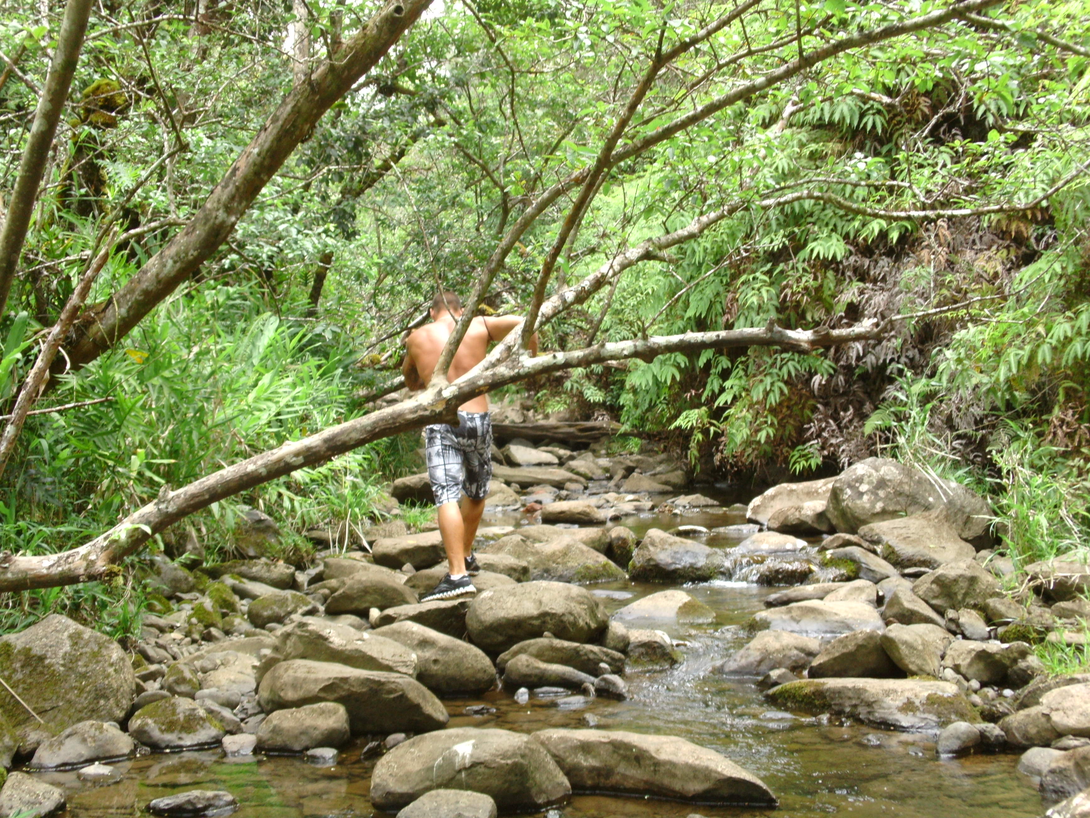 The stream became rockier, which enabled me to keep my feet out of the water. I stopped following TJ’s footsteps because he had no qualms about getting his feet wet, and I preferred to bounce along behind him in wild, zig-zagging patterns. After half an hour, the stream narrowed and low-hanging branches cobwebbed across it, forcing us to crawl over and under them. It felt very Mission Impossible, like the branches were security lasers and we were Tom Cruise acting stealth.