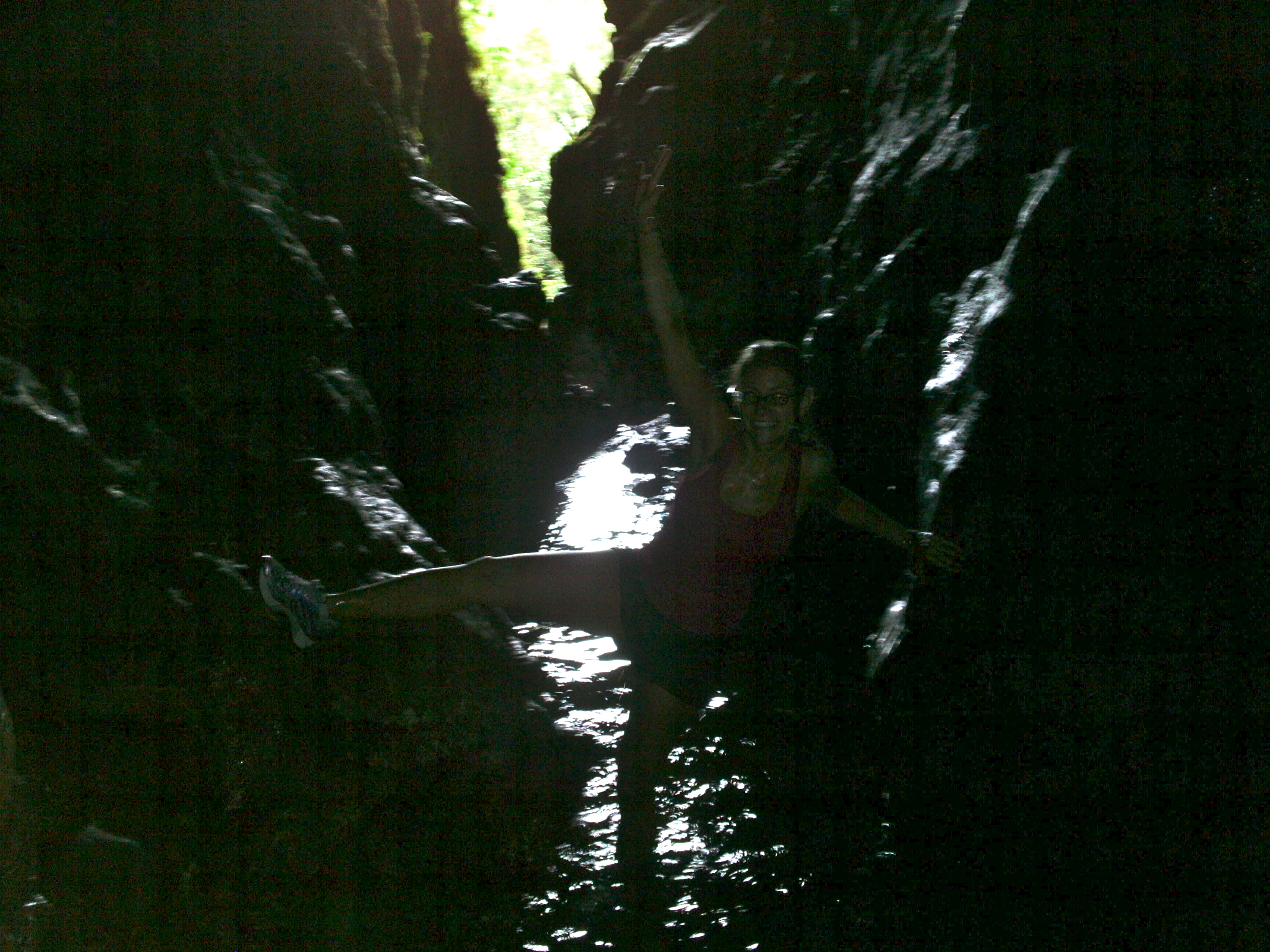 The scariest moment for me was waterfall number two. It was just as tall as waterfall number one, but we were in a dark cave, swimming to its base, grabbing onto wet rocks to hoist ourselves up. It turned out to be easier than it looked (the handholds were sturdy), but me being the genius I am didn’t realize that one could stand at the bottom of the waterfall. Since we had to swim to get there, I assumed the water was still deep. So I was spiderman crawling along the walls and slipped, and instead of falling into the depths of the water, I hit rock—on my thigh, both knees, and right shoulder blade. At that point, I stood up and successfully (though in pain) climbed to the next level.