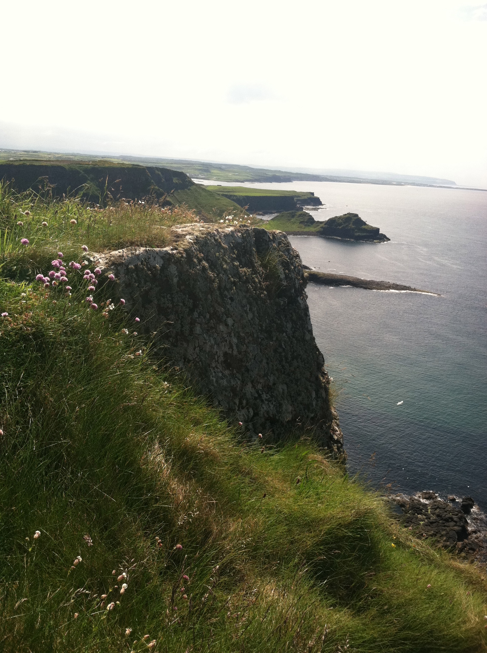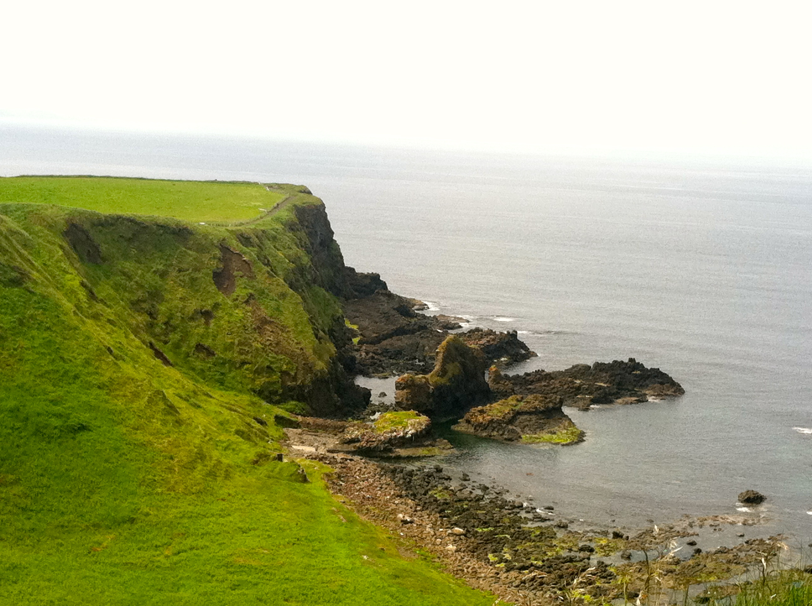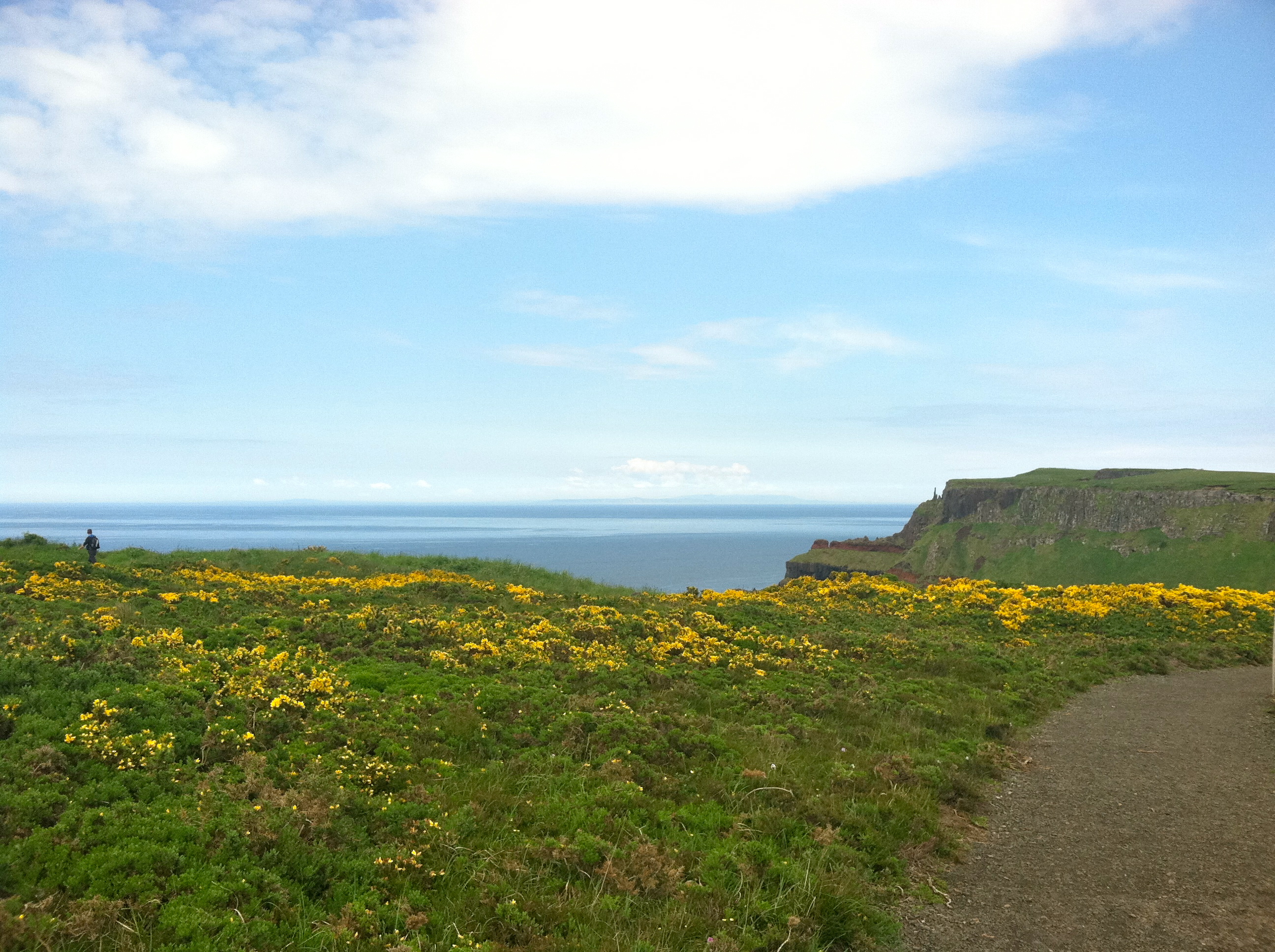 At Giant’s Causeway, there are three walking trails labeled by color: the red, the blue, and the yellow. The blue is the low trail and meanders along the seaside; the red and yellow are the high road. The high road is less traveled (Frost must have taken it); it extends for miles, and it provides absolutely stunning views. Every third word out of Taryn’s or my mouth was “wow!” That could also be because we were partially blinded by chlorophyll-produced coloration—“green,” I believe they call it—that we were not used to seeing coming from the desert.