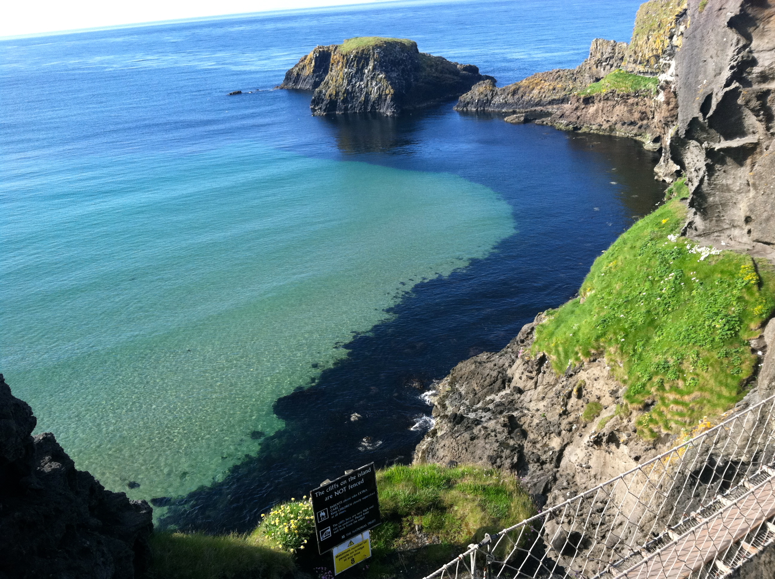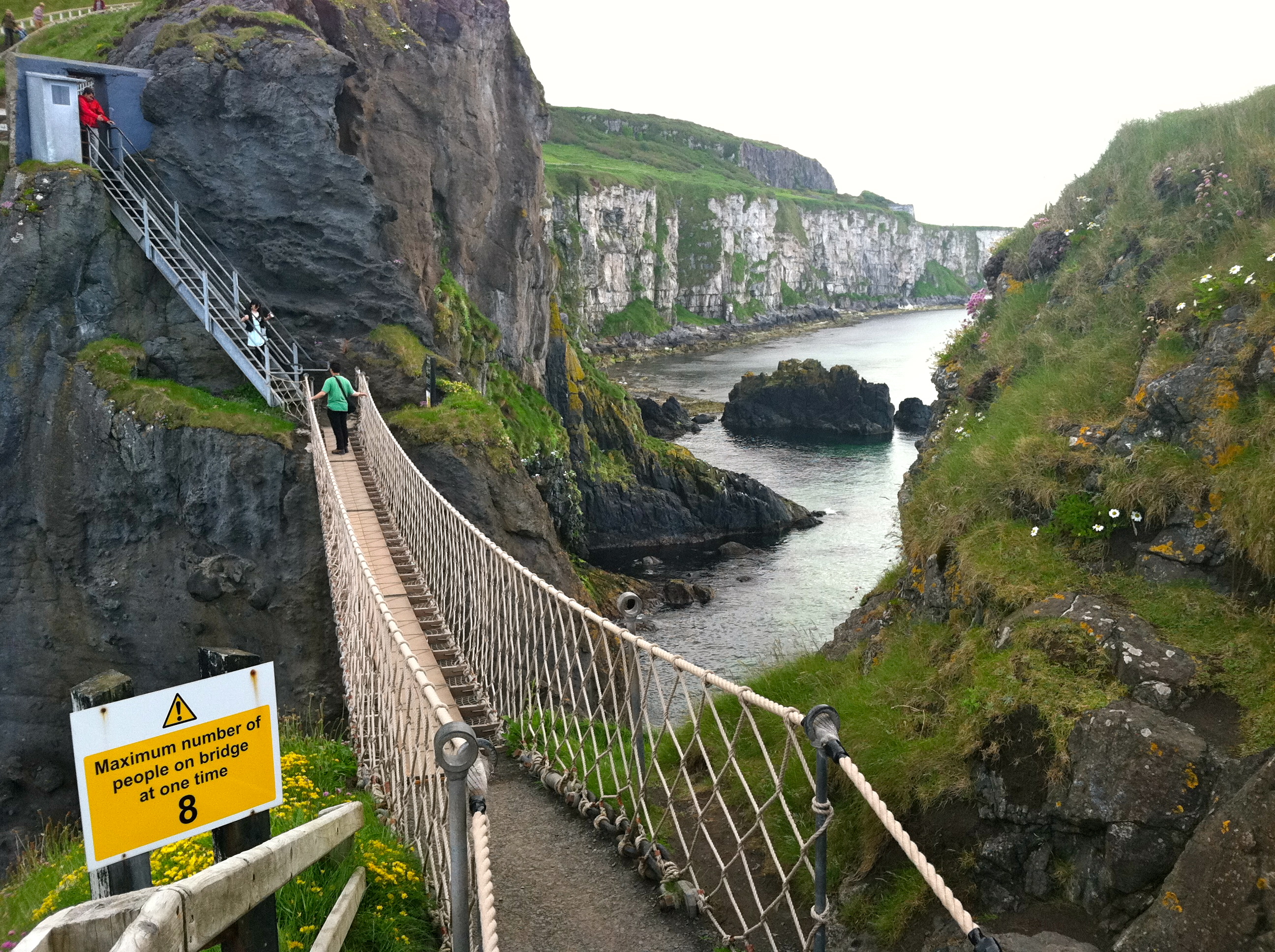 From there we headed back east (we did sort of an east-west/east-west pattern, excluding the four u-turns we made in an effort to find a non-existent gas station) to Carrick-a-Rede bridge, which looks like this from a distance: