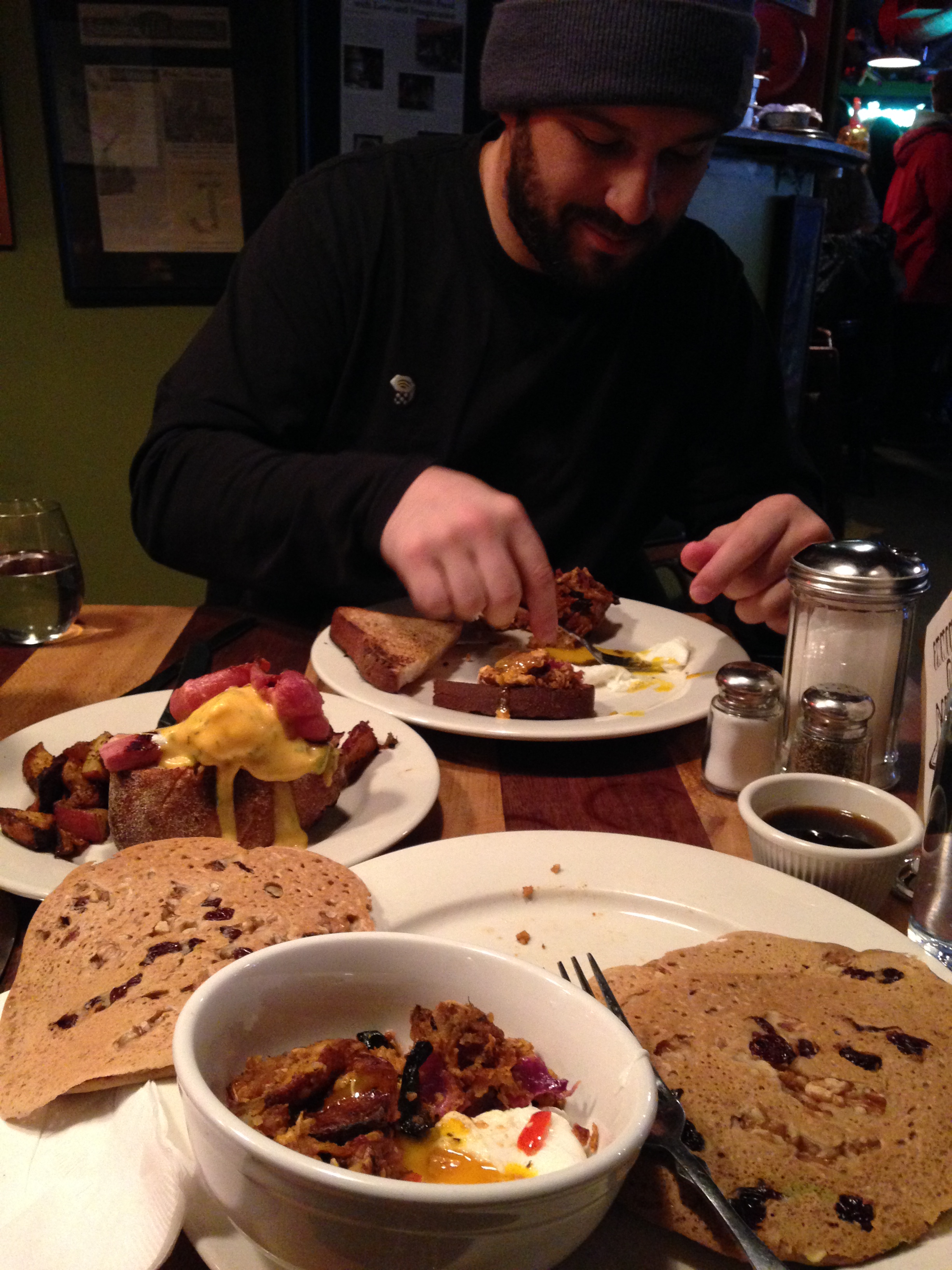 (BBQ chicken hash with peppers, red onions, poached eggs and toast; the eggs benedict special with home-fried potatoes; espresso, walnut, and cranberry vegan pancakes with mocha maple syrup. Not pictured: Chai Tea Latte and Soy Hot Chocolate)