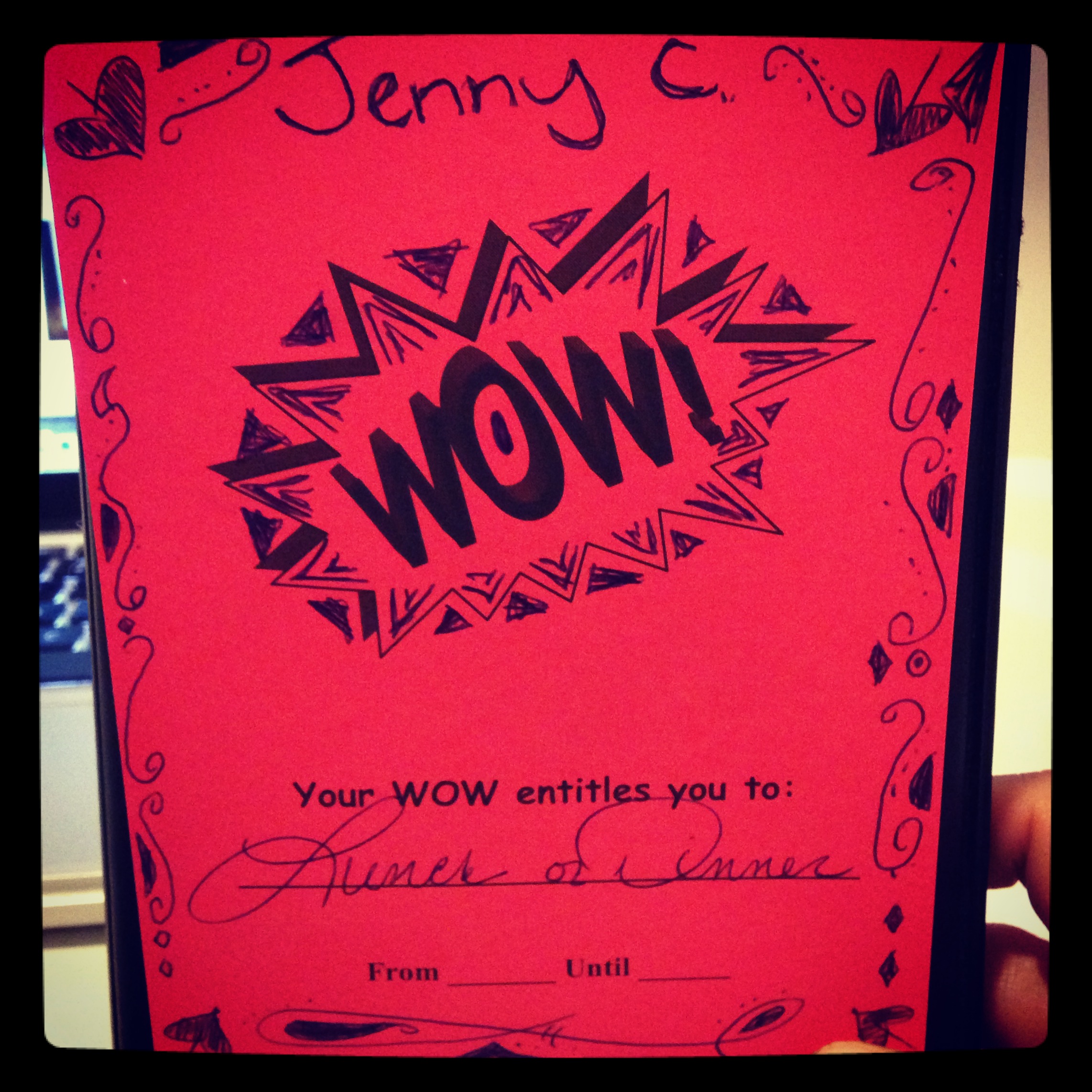 However, because I am prone to saying things at work like: “You know what sucks? Mean people,” I feel I ought to make note of what is really awesome, and that is nice people. For example, my restaurant regulars came in for lunch and brought me a Christmas card (I showed it off to everyone; I was so happy), and at the end of my shift my managers gave me a “WOW” card, redeemable for a free lunch or dinner. As a testament to my manager’s appreciation and/or level of boredom, he decorated it, and by his request, I’ve taken a picture.
