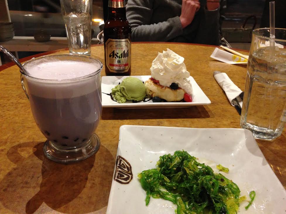 Bubble tea, seaweed salad, green tea ice cream, and a berry “moffle.” (The Asian beer is not mine.)