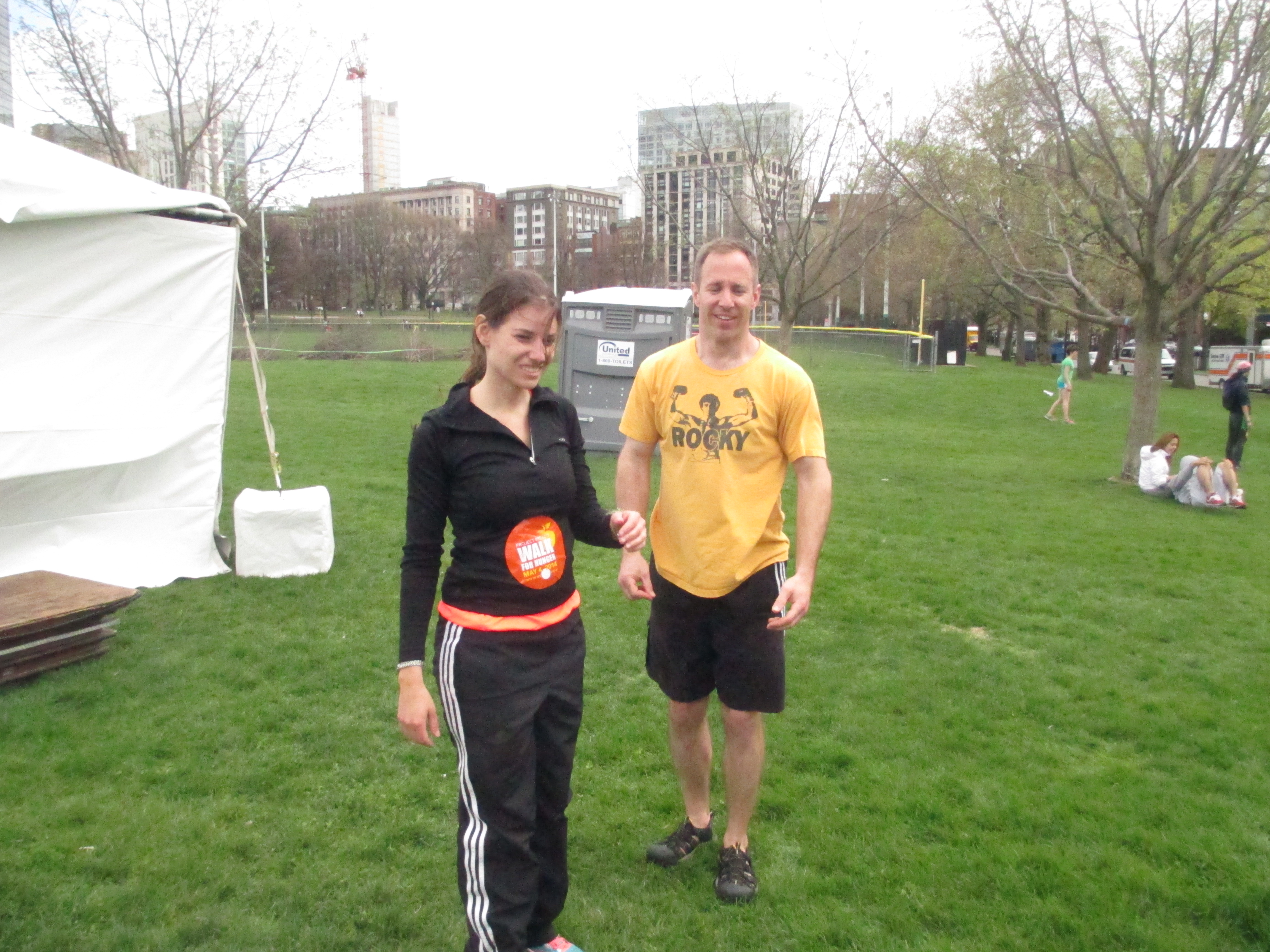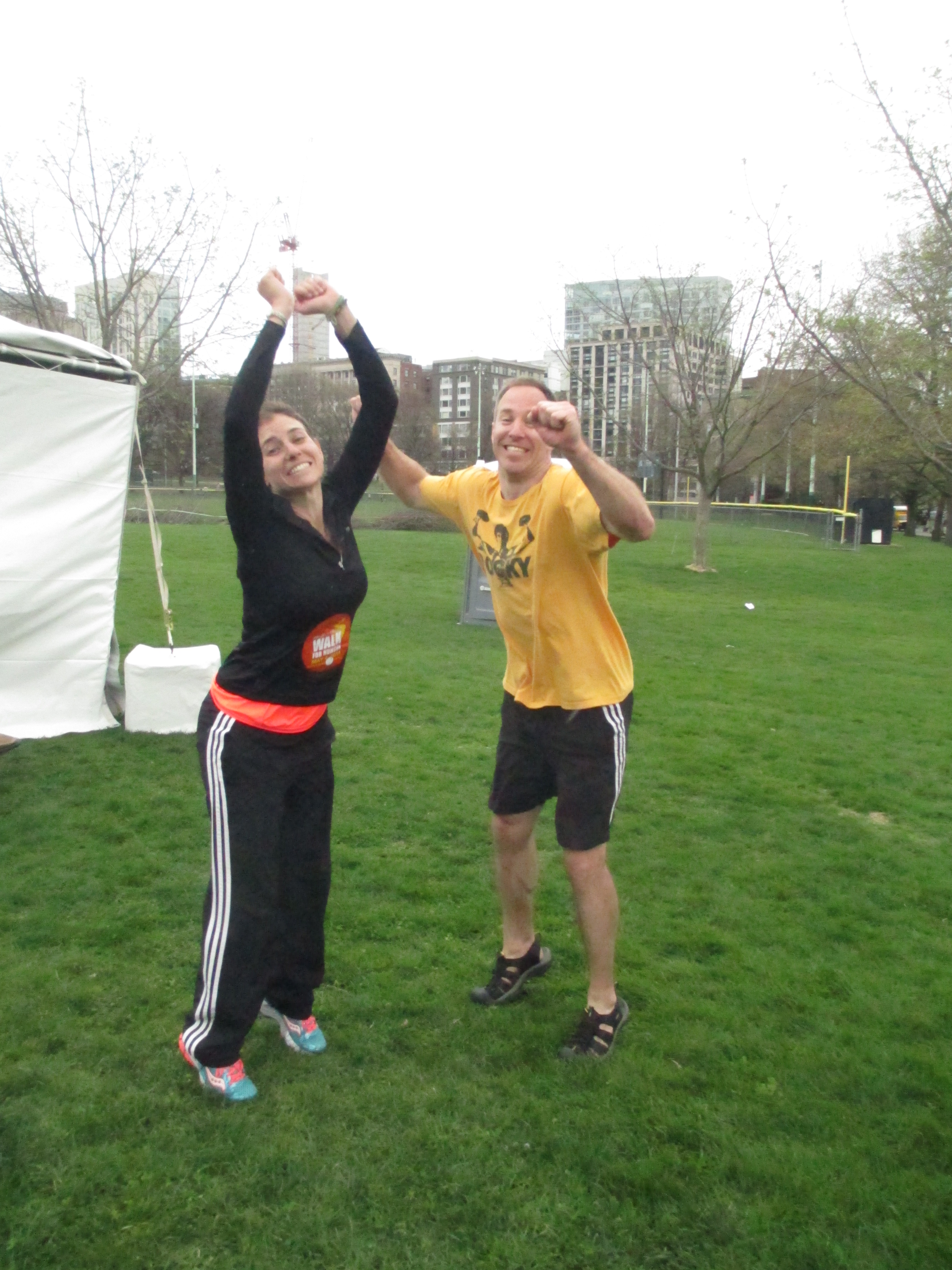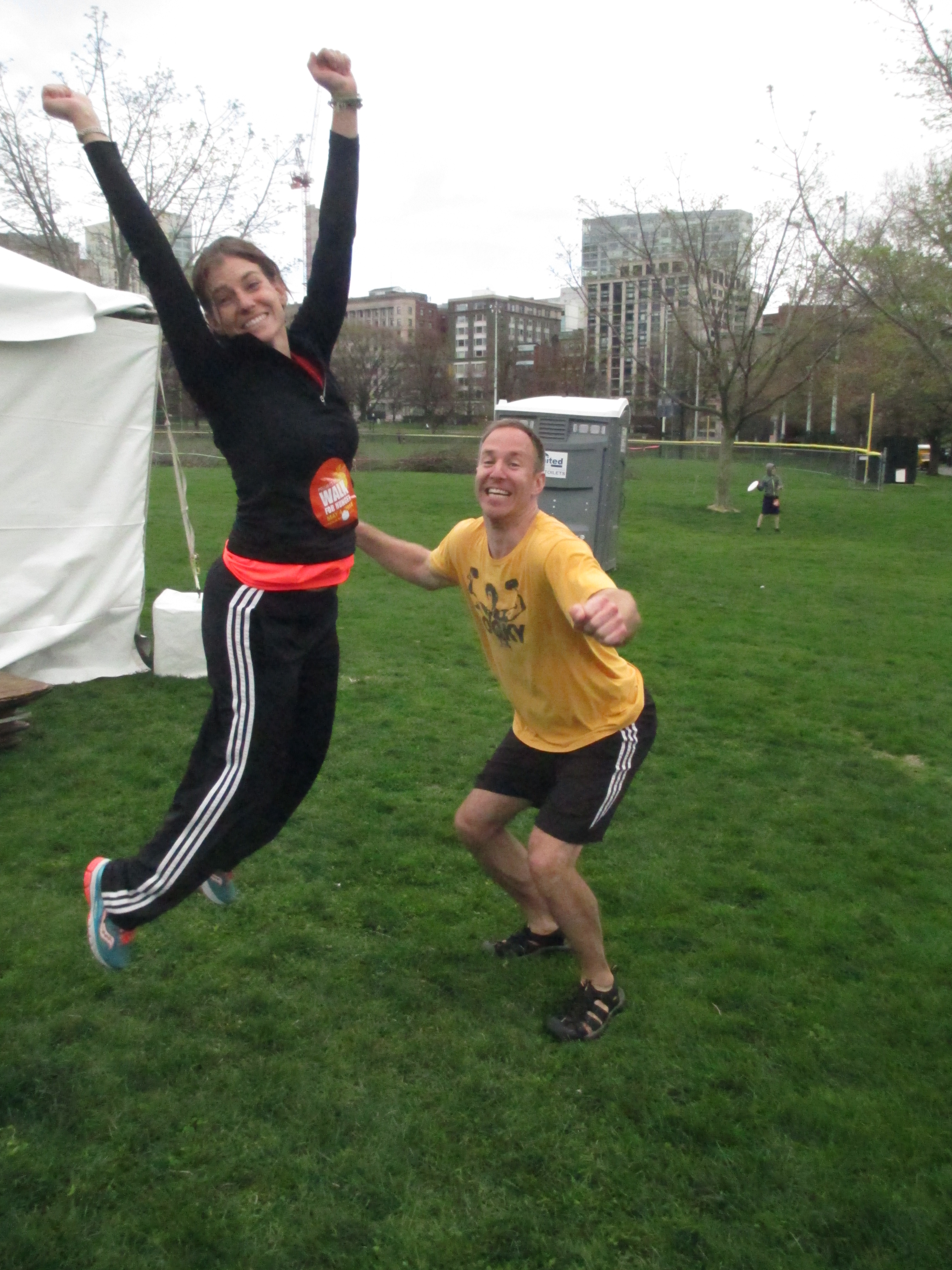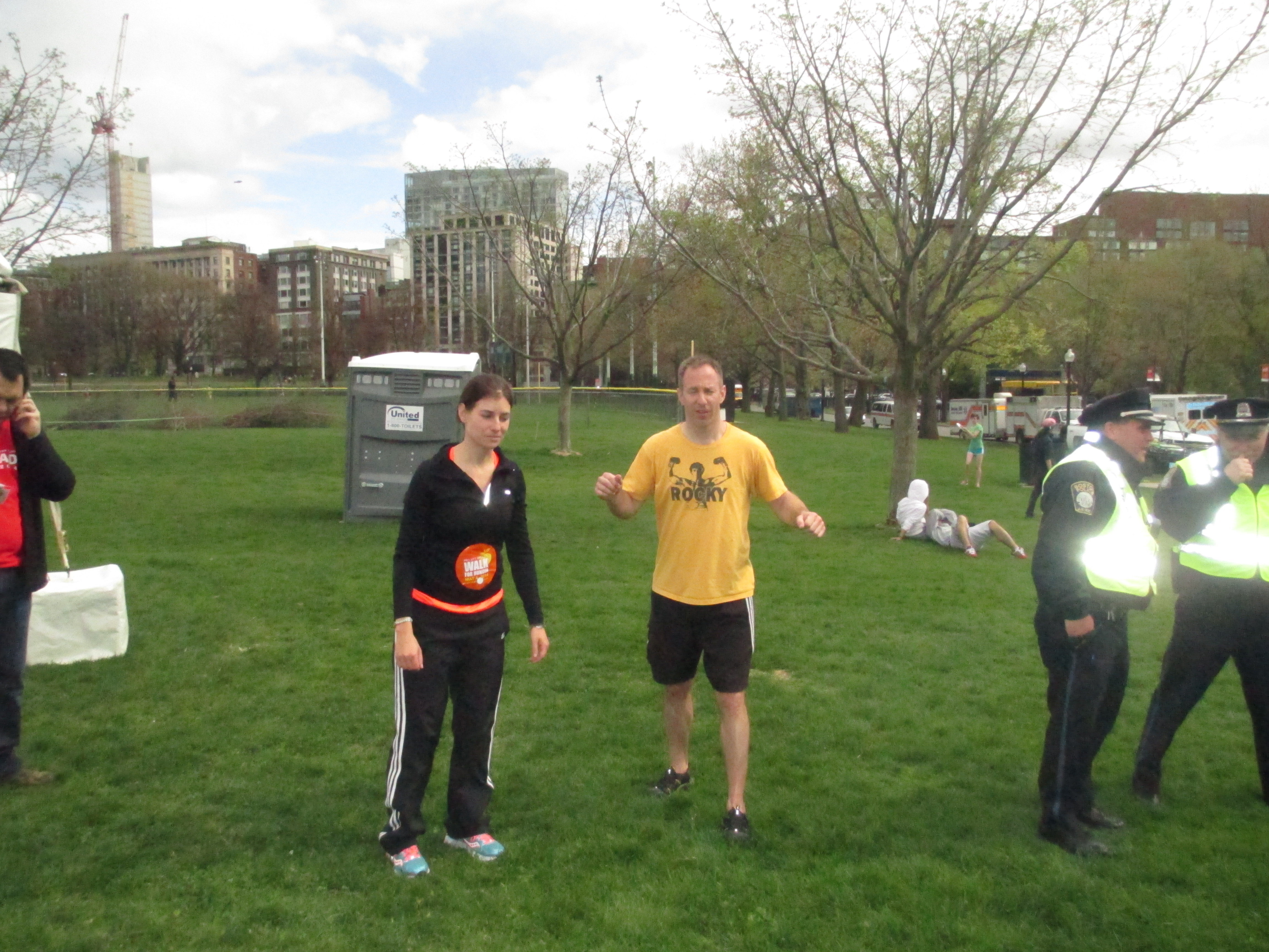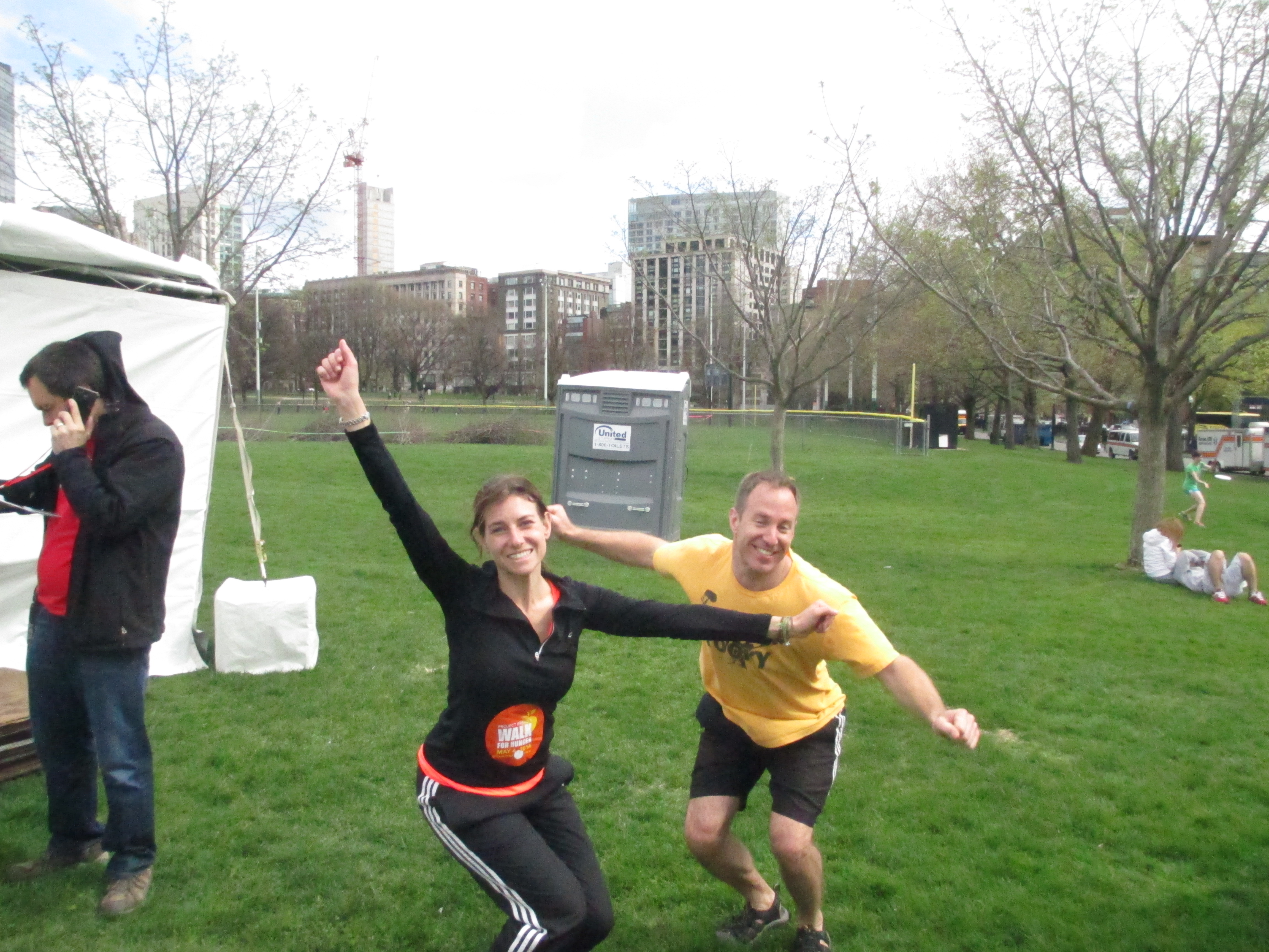 After finishing our 20 mile jaunt through Boston, my friend and I wanted to take a celebratory photo. M-dog* suggested a photo in which the both of us are jumping, so he asked his colleague to take a photo of us in jubilant airborne exultation.