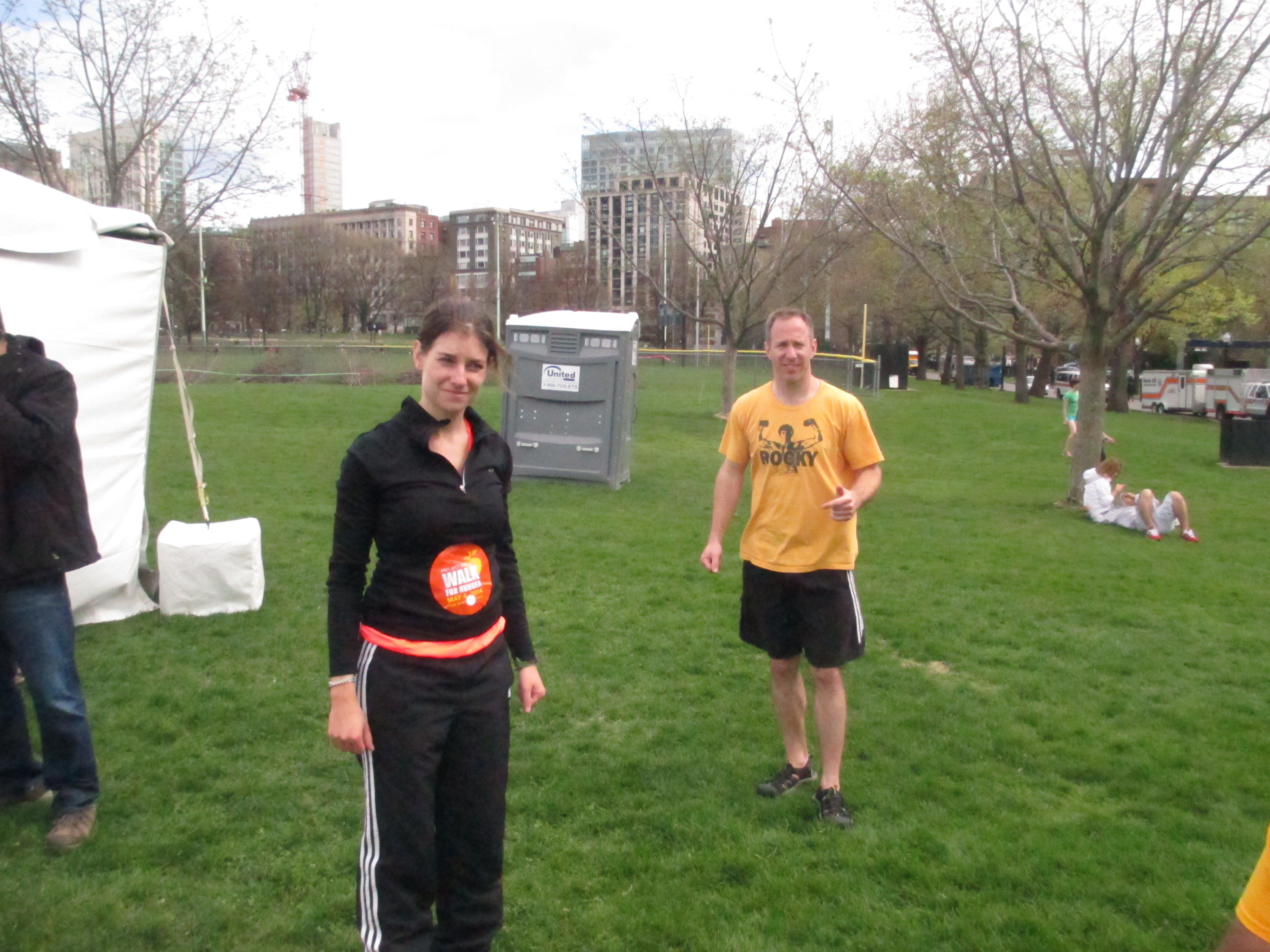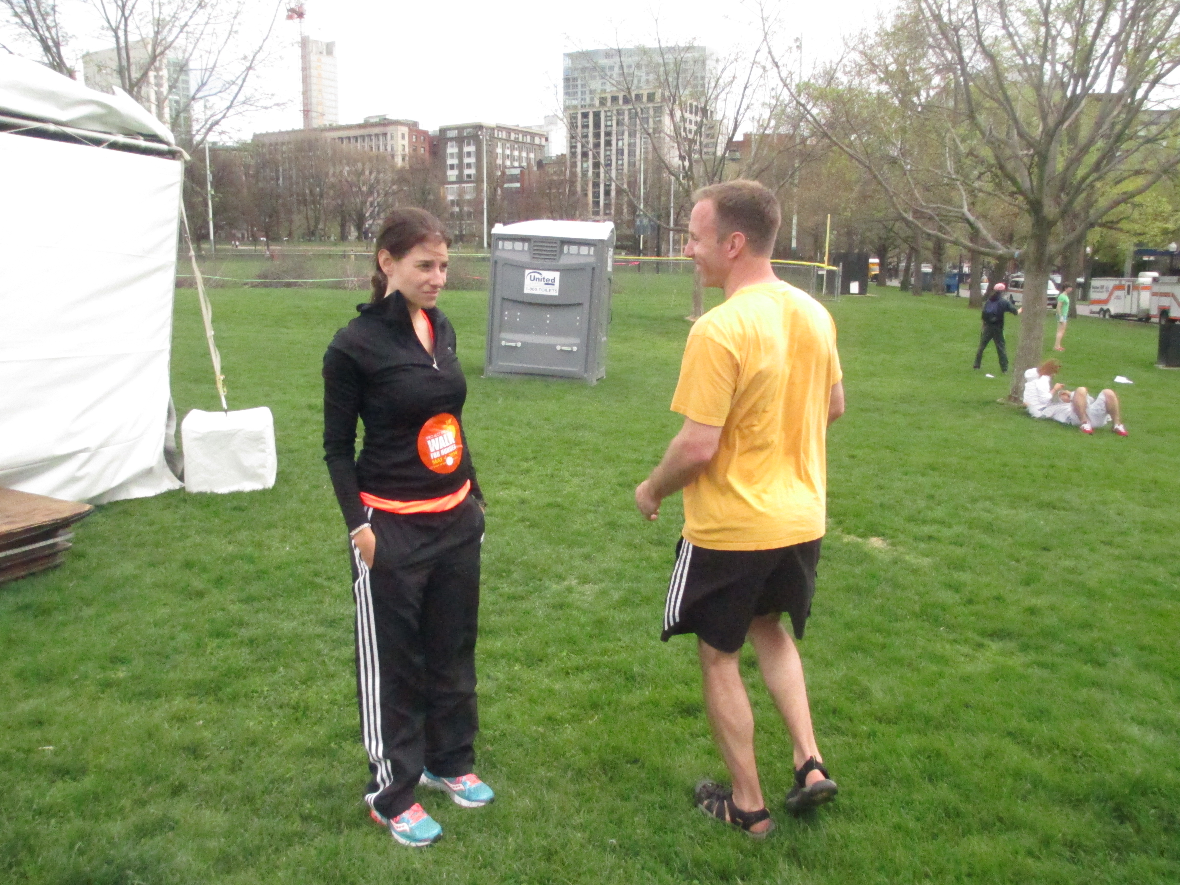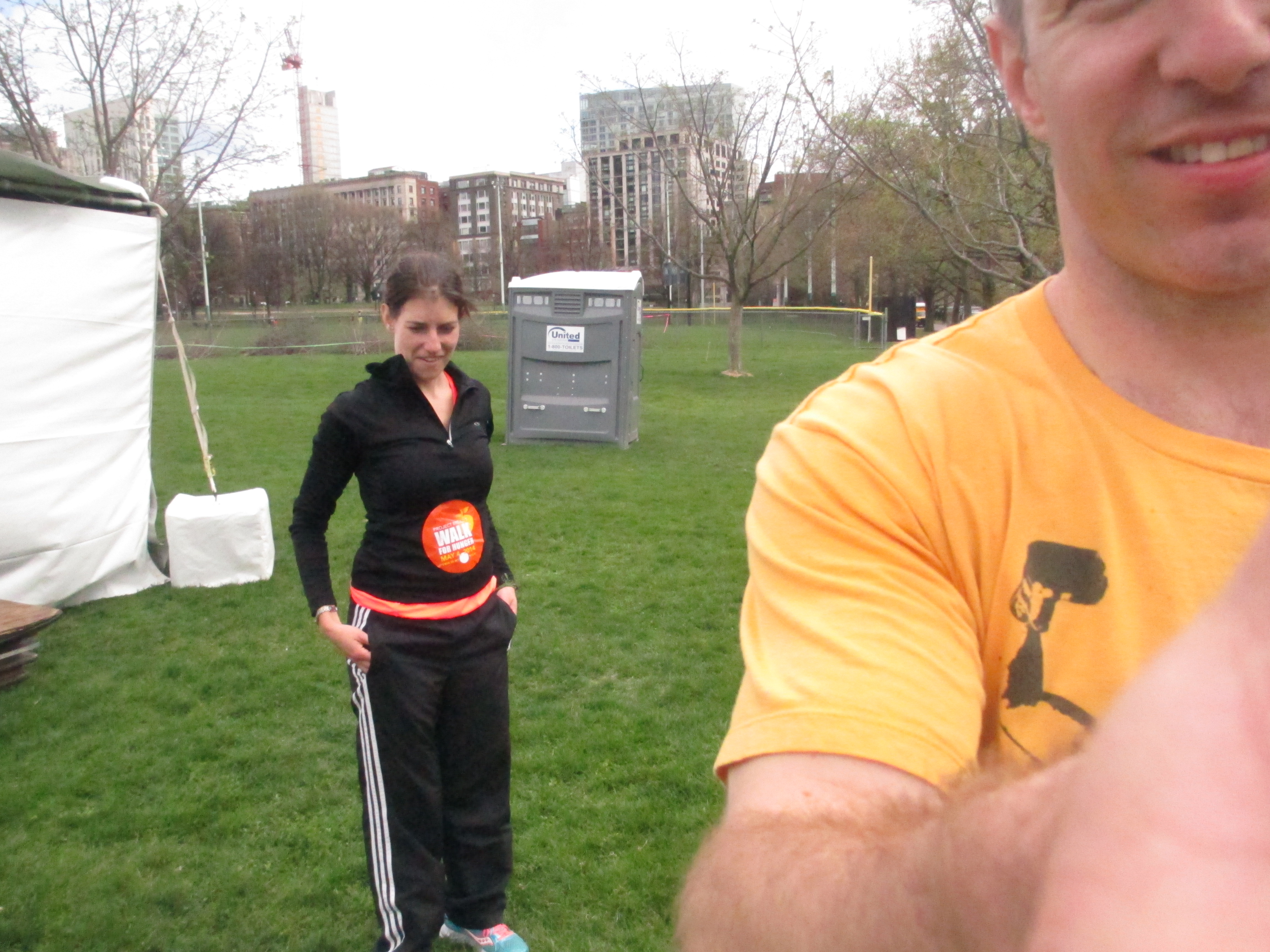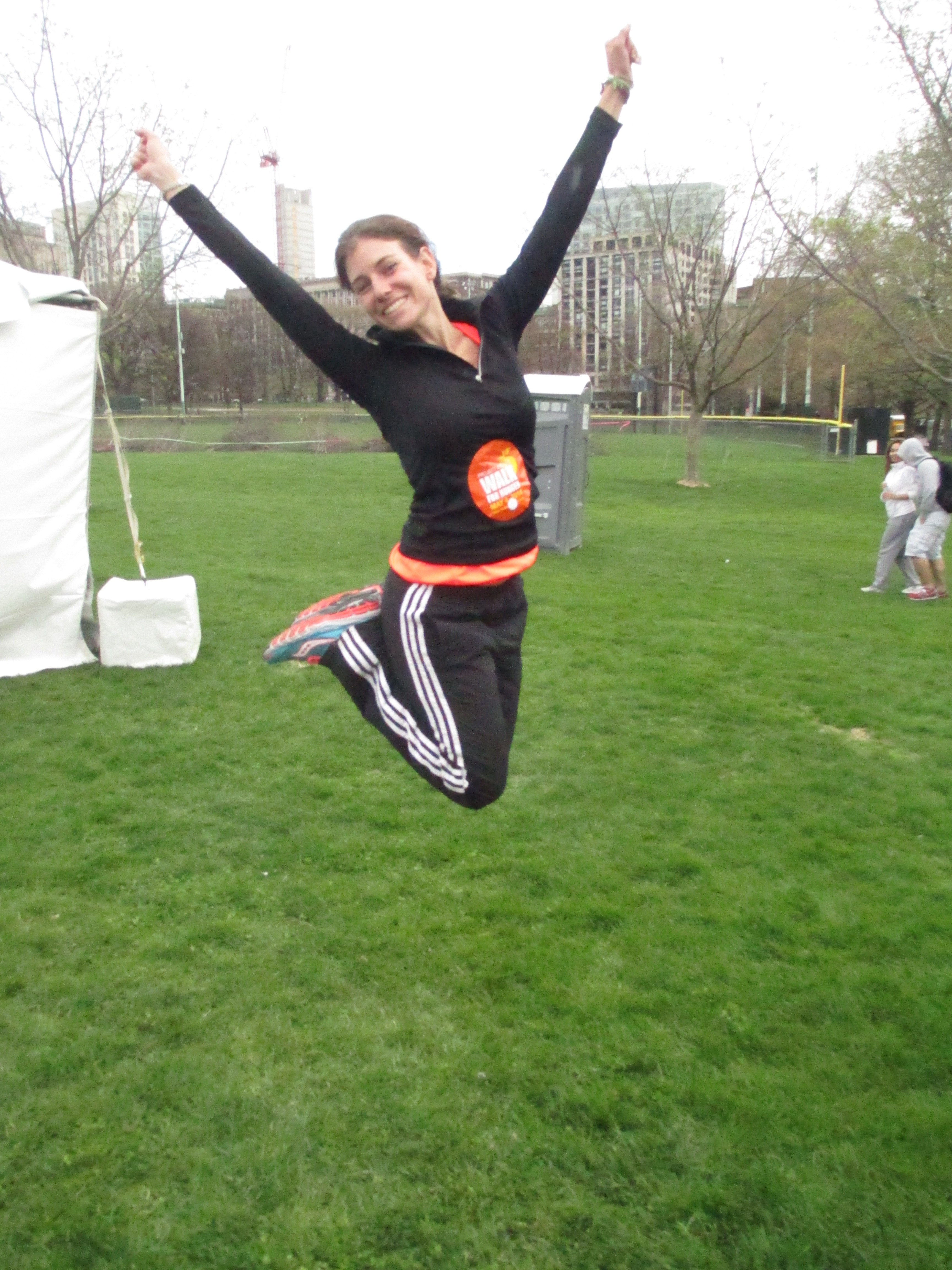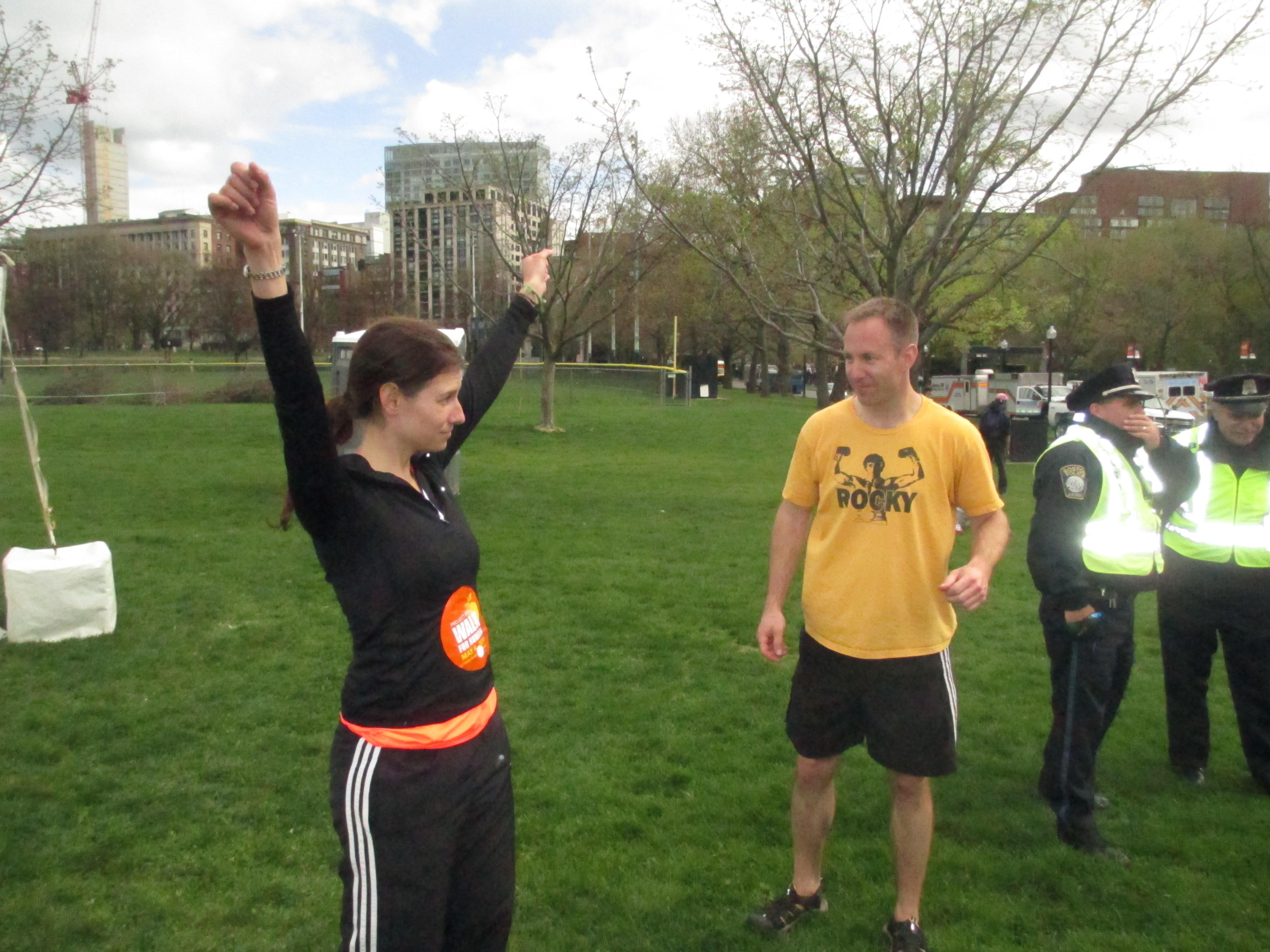 After finishing our 20 mile jaunt through Boston, my friend and I wanted to take a celebratory photo. M-dog* suggested a photo in which the both of us are jumping, so he asked his colleague to take a photo of us in jubilant airborne exultation.