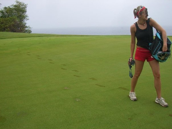 The rain finally stopped a bit, and by this time we were more than severely lost, not having any idea where we were supposed to have turned, as there were no signs indicating “this way to the 18th green!” So after much walking, raining, and with my cankle bleeding through my socks, we ended up directly on the 18th green instead of near it.