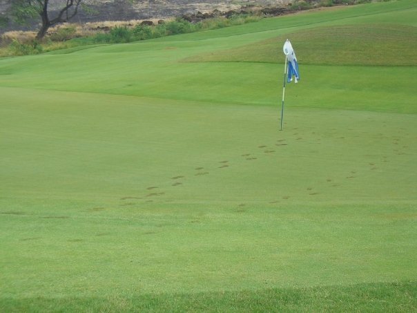 We’d created muddy footprints across the immaculately-kept green on the most scenic hole of this five-star resort’s golf course. It was like invasion of the mud people.