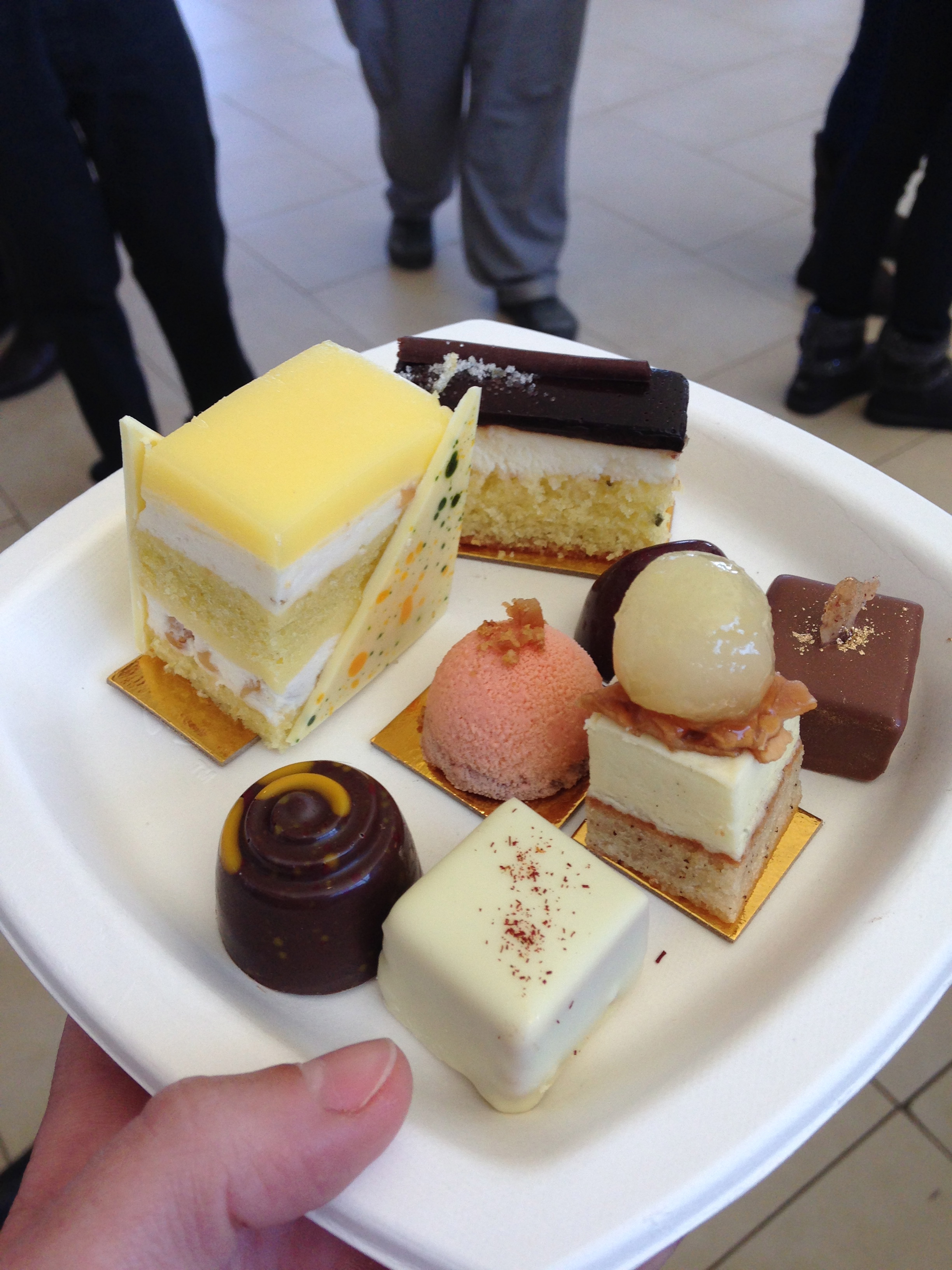 Another benefit of Taste Trekkers was meeting JWU folks who keep me privy to events that are closed to the public. As a culinary institute, students’ finals include presenting their work, whether it be tapas or bread-making or “pastries.” I was invited to the pastries demonstration and I thought of croissants filled with diced apples. What I arrived to was a room full of tables covered in chocolate truffles and mouses and cakes and macaroons. It was where I go in my dreams when calories don’t exist, and neither does diabetes. I am the Queen of Trying Everything. Dessert buffets, potlucks, Thanksgiving dinners–I must have one of everything. So, that was my goal here. Well, I failed by 1000%. I ate the equivalent of three boxes of chocolates and made myself ill, but I conquered less than half of the room. As I told one chef, “I finally came up against dessert, and dessert won.”