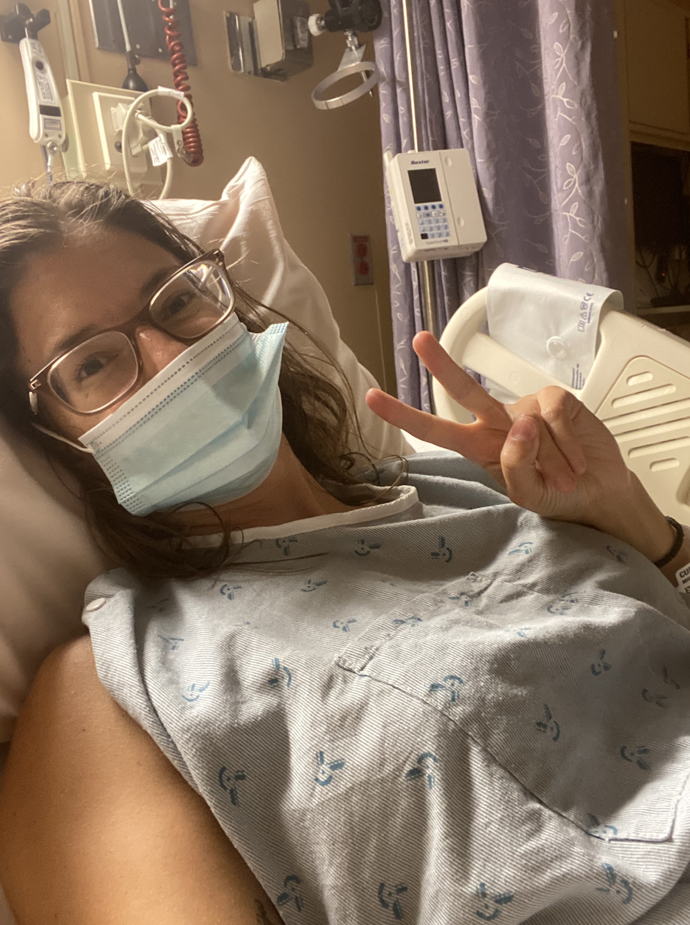 At 2:30pm, after fasting from food and water since throwing them all up–I was so parched!–they took me to my “permanent” room on the 4th floor. My new nurse was very sweet and bubbly, and she told me to use the call button before going to the bathroom. “We just want to make sure you’re not a fall hazard…most of our patients are a little older than you,” she explained. She told me it might still be hours before I was called into surgery, that “end of day” was 10pm. She dropped off a gown and told me I could hold off on changing.