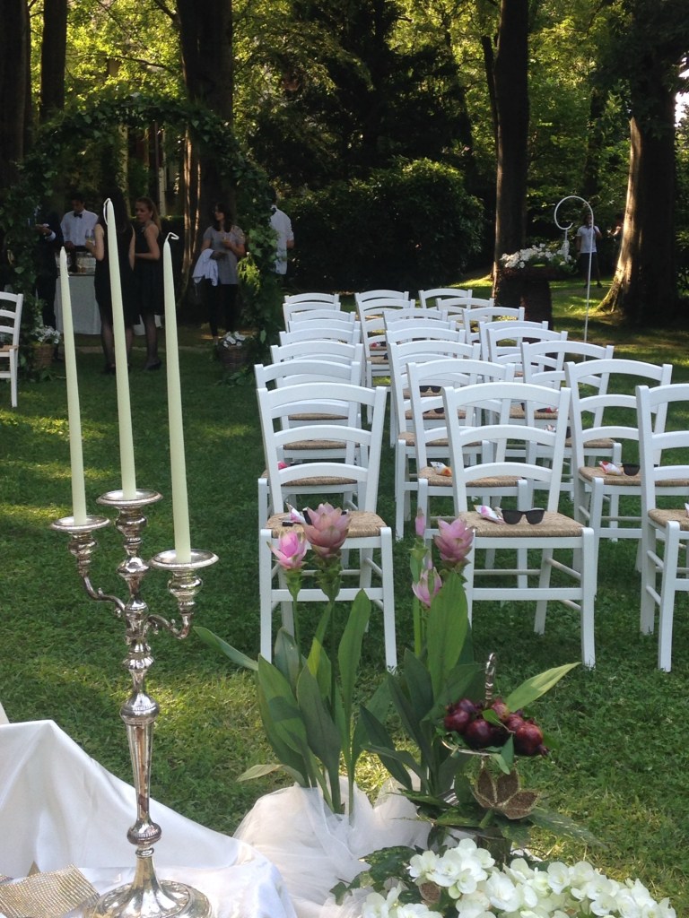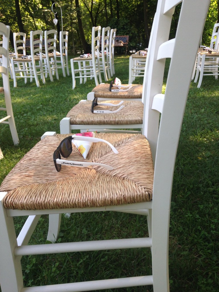 The following day was the wedding itself. It was a beautiful sunny day in August. The ceremony took place in a garden estate, with white chairs lined up on the grass on either side of a flower and vine adorned arch. On each chair were our party favors, custom sunglasses with “Niusha ❤ Alessandro” along the side of the frame (I still have these glasses, by the way), and rice to throw on the bride and groom wrapped in a flower printed paper cone.