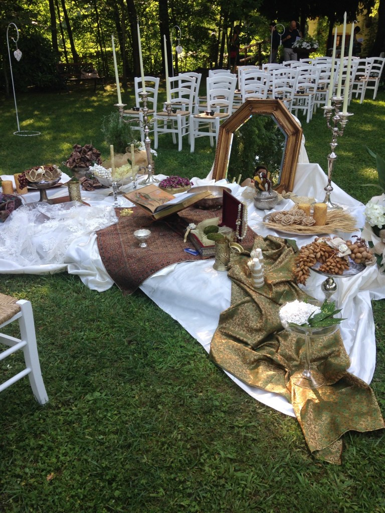 There was a beautiful arrangement of items where I would expect the bride and groom to stand, but instead they sat facing us, and facing the items: a large decorative mirror, tall and short candlesticks, an array of fruits (like grapes) and nuts (like almonds) on silver stands, beads and colorful pashminas and intricate lace atop a white cloth. At one point, the bridesmaids held a lacy veil over the couple. I was not familiar with the ceremony itself, nor could I hear what was being said, but every now and then the couple next to me would explain something. (The wife was Iranian, and her husband, I believe, was German. They were living in Italy.)